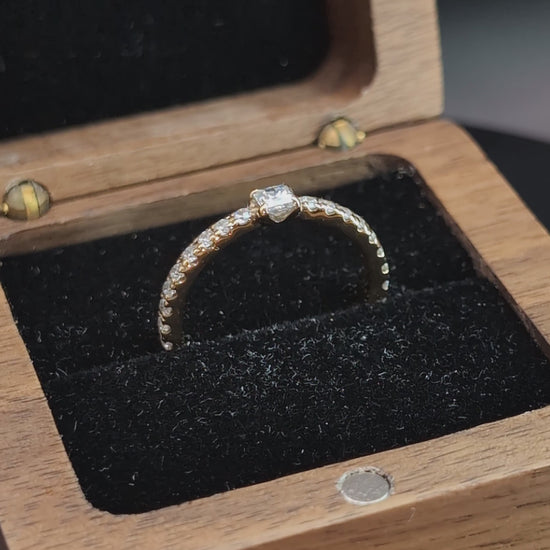 Su diseño gira en torno a una piedra central talla princesa, perfectamente engastada, que atrae todas las miradas. A su alrededor, una línea de pequeñas piedras completa el círculo de brillo que da nombre al Eternity Ring.
