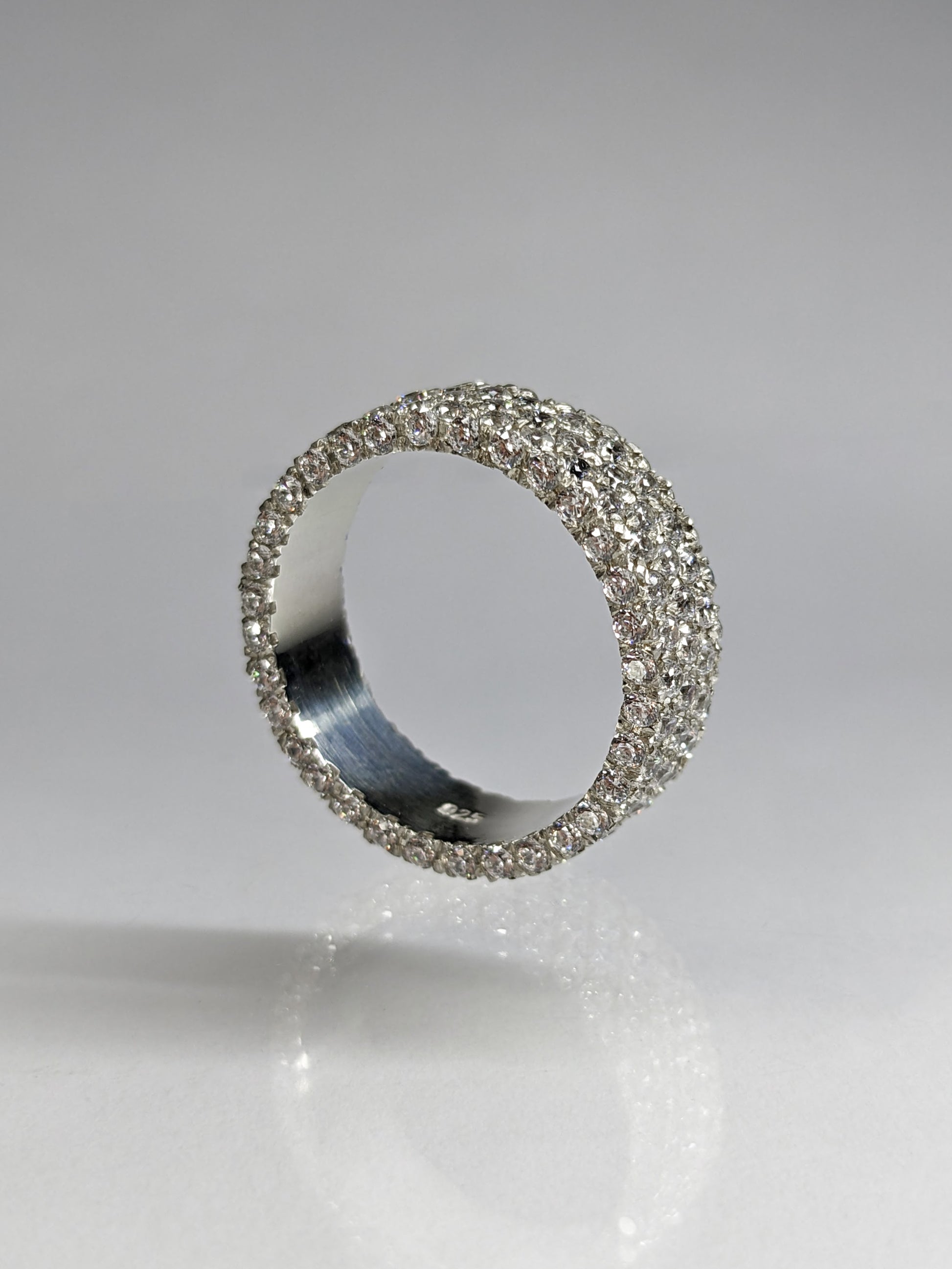 Este anillo de plata de ley 925, está completamente engastado con circonitas blancas en pavé, cubriendo toda su superficie con un brillo continuo y elegante. Cada piedra está colocada a mano, una a una, creando un efecto espejo que refleja la luz desde cualquier ángulo.